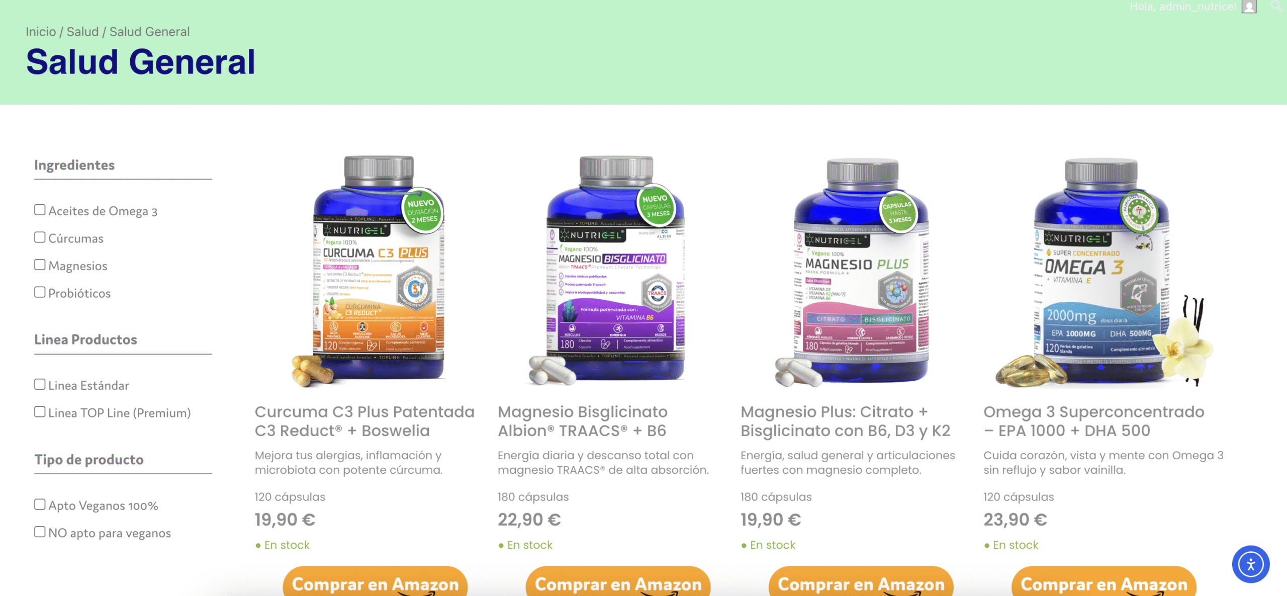 El sitio incluye una cuidada integración de los productos disponibles en Amazon, ofreciendo un escaparate claro, limpio y accesible. Cada detalle ha sido pensado para transmitir confianza, claridad y compromiso con la salud.